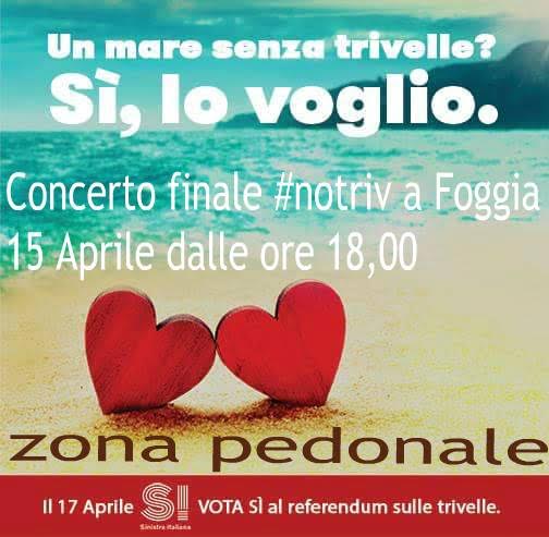 Chiusura della campagna referendaria pugliese con concertone finale, quella organizzata dalle reti No-Triv il prossimo 15 aprile in Piazza a Foggia nei pressi dell’Isola Pedonale in Corso Giordano, a partire dalle 19.00, per chiedere ai cittadini di votare ‘SI’ al referendum popolare del 17 aprile per abrogare la norma che consente alle società di estrarre petrolio e gas in mare entro le 12 miglia fino ad esaurimento del giacimento. Alla giornata di mobilitazione interverrà il Presidente della Regione Puglia Michele Emiliano, oltre al sindaco di Foggia, Franco Landella, i rappresentanti nazionali delle associazioni e dei comitati per il ‘SI’, il Presidente del Parco del Gargano, Stefano Pecorella, il delegato referendario regionale e già Vicepresidente del Consiglio, Giandiego Gatta. Gli interventi politici verranno alternati dalle esibizioni artistiche e musicali dei Cantori di Carpino, dei ‘Terramia’, di Roberta Palumbo, Marco Milano, Vinvè, e poi ancora del gruppo ‘Le Indie di Quaggiù’, de ‘I Tavola 28’, per concludere l’evento clou con ‘La Notte della Taranta’.