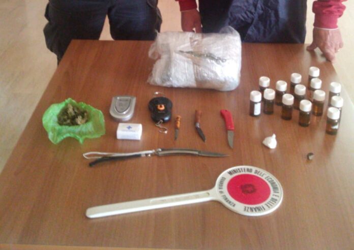 La successiva perquisizione domiciliare consentiva di rinvenire e sequestrare, abilmente occultati in vari locali dell’abitazione, una confezione contenente 1 Kg. circa di marijuana, 1 gr. di hashish, 14 flaconi di metadone, con etichetta rimossa, detenuti in assenza di prescrizione medica, gr. 10 di sostanza da taglio, n. 2 bilancini e nr. 4 coltelli a serramanico. Il responsabile, è stato tratto in arresto per traffico di sostanze stupefacenti e posto a disposizione dell’Autorità Giudiziaria, che ne ha disposto la custodia cautelare in carcere.
