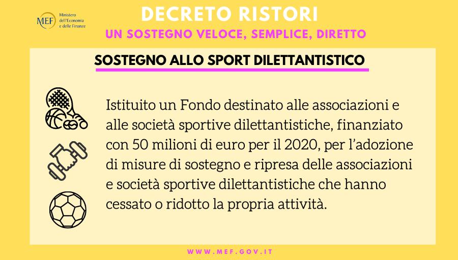 “Per far fronte alle difficoltà delle associazioni e società sportive dilettantistiche viene istituito un apposito Fondo le cui risorse verranno assegnate al Dipartimento per lo Sport”, si legge in una nota del Ministero dell’Economia.