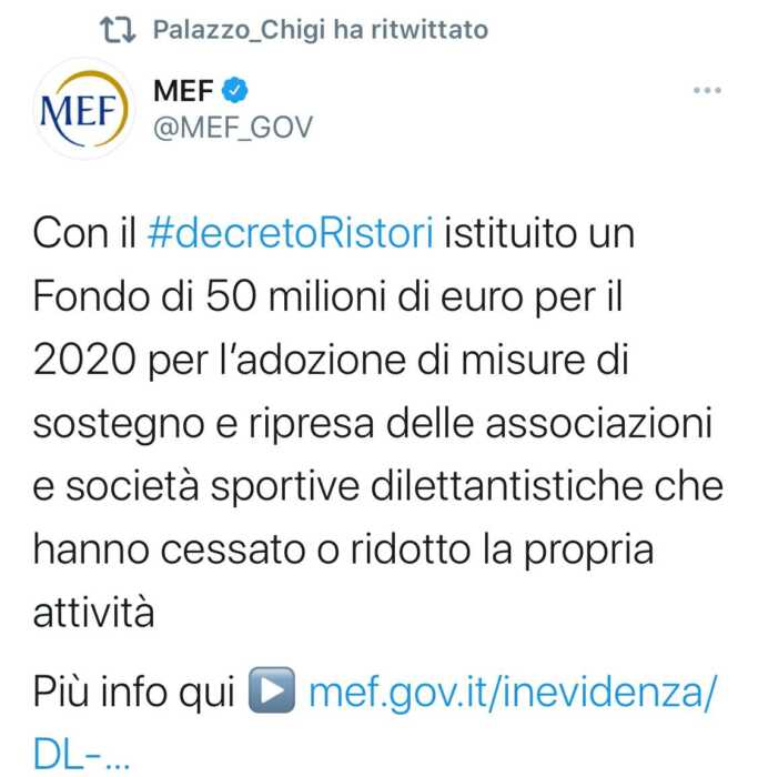 “Il Fondo viene rifinanziato per 50 milioni di euro per il 2020 per l’adozione di misure di sostegno e ripresa delle associazioni e società sportive dilettantistiche che hanno cessato o ridotto la propria attività, tenendo conto del servizio di interesse generale che queste associazioni svolgono, soprattutto per le comunità locali e i giovani”.