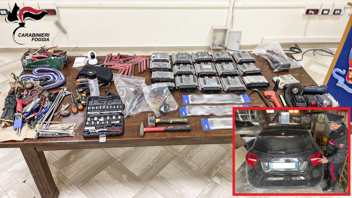 Alcuni giorni fa infatti i militari dell’Arma hanno fatto irruzione in un casolare in agro di Foggia – località Borgo Incoronata – dove, nel corso di una perquisizione domiciliare d’iniziativa, hanno rinvenuto una Mercedes classe A opportunamente occultata all’interno di un box chiuso con un grosso lucchetto le cui chiavi erano nella disponibilità di un 28enne rumeno. Da accertamenti esperiti sul telaio dell’autovettura la stessa è risultata essere oggetto di furto perpetrato a Bari nell’ottobre del 2016 mentre le targhe sono risultate appartenere ad una Ford Fiesta anch’essa oggetto di furto perpetrato pochi giorni addietro nel capoluogo dauno. All’interno della suddetta autovettura i carabinieri hanno constatato la presenza di un vero e proprio “arsenale” di strumenti di effrazione da utilizzare per i furti di e su autovettura. Nello specifico è stato rinvenuto un disturbatore di frequenze comunemente chiamato “Jammer” utilizzato per rendere inefficaci i sistemi antifurto satellitare, 16 centraline di varie autovetture, 2 ricetrasmittenti pronte all’uso, numerosi attrezzi da lavoro da utilizzare per lo smontaggio su strada dei veicoli, una coppia di targhe clonate da altro veicolo in circolazione perfettamente uguali a quelle fornite dalla motorizzazione oltre ad una piastra di metallo con funzione di blindatura realizzata artigianalmente e posizionata nella parte posteriore del veicolo molto probabilmente quale protezione in caso di possibili conflitti a fuoco.